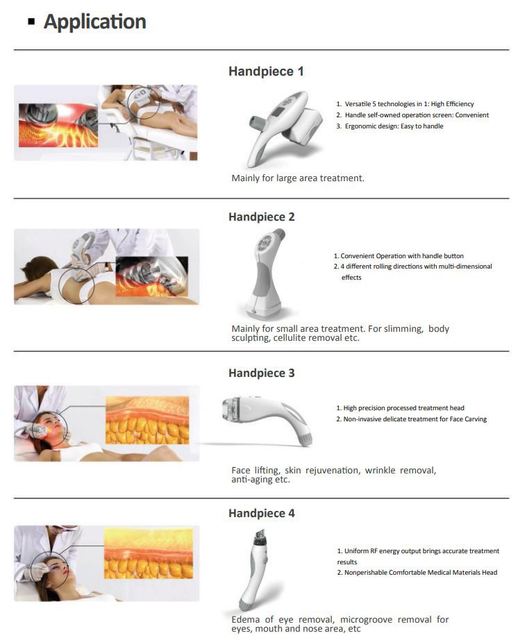 SLIM4 ترکیبی عالی از پنج فناوری است: خلاء، غلتک ماساژ مکانیکی، نور مادون قرمز، RF دوقطبی و نور LED. راه حلی برای لاغری بدن، حذف چربی، کاهش سلولیت، جوانسازی پوست، سفید کردن پوست، سفت کردن پوست، رفع آکنه، بهبود علائم کشش، سم زدایی لنفاوی، مریدین لایروبی می دهد.